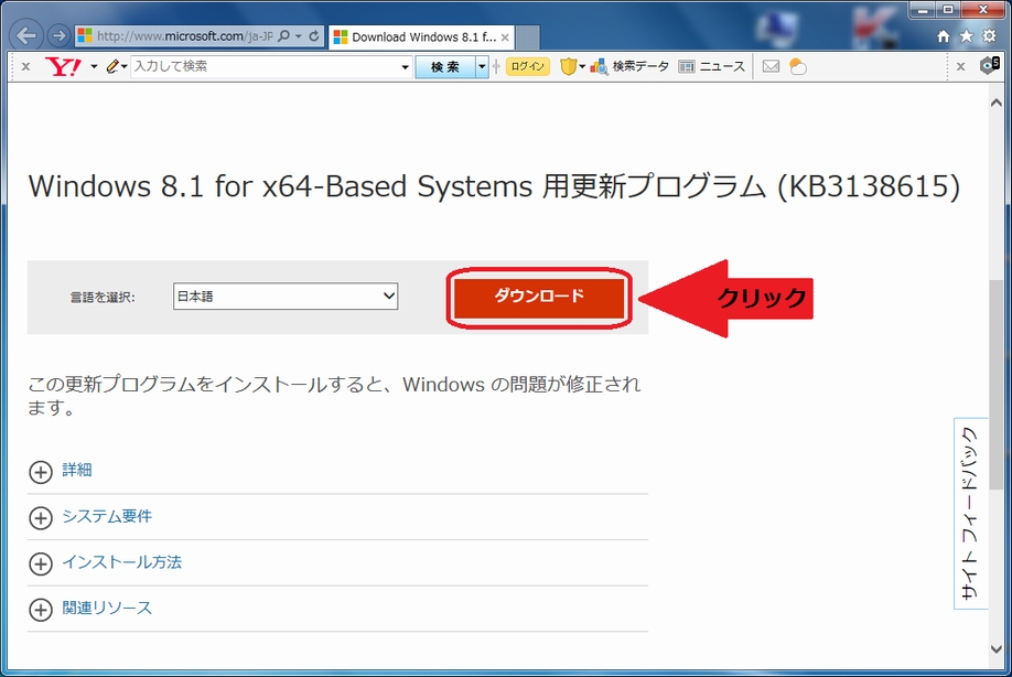 お使いのパソコンのシステムの種類によってインストールする更新プログラムが異なります。該当するURLをクリックしてください。